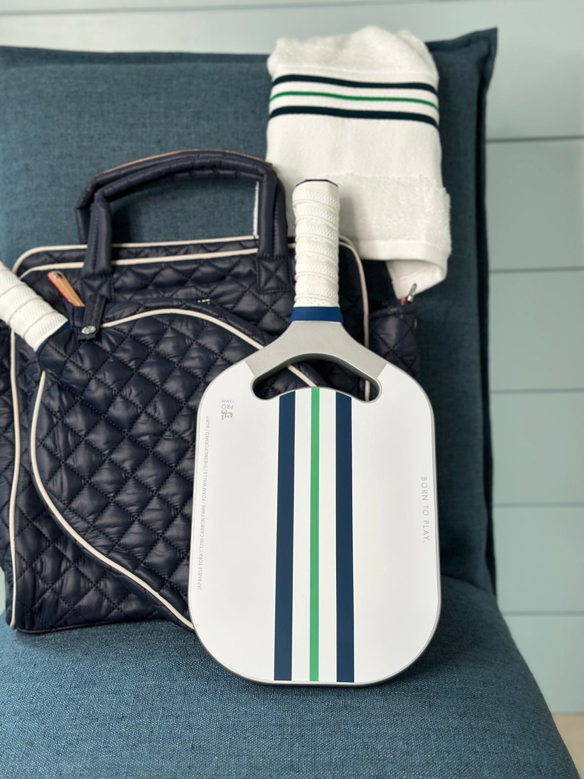 Japanese Toray T700 carbon fibre, thermoformed with foam walls and XGRIT surface for spin and control. A good feel for for the tennis player who also plays pickleball. Extra long face and handle, custom color grip tape. Modern meets retro design with a club aesthetic in your choice of—white paddle with navy/green stripe and metallic silver details or navy/deep pink stripe with metallic gold details. Coordinating colors and pattern in the towel and water bottle pull it all together.