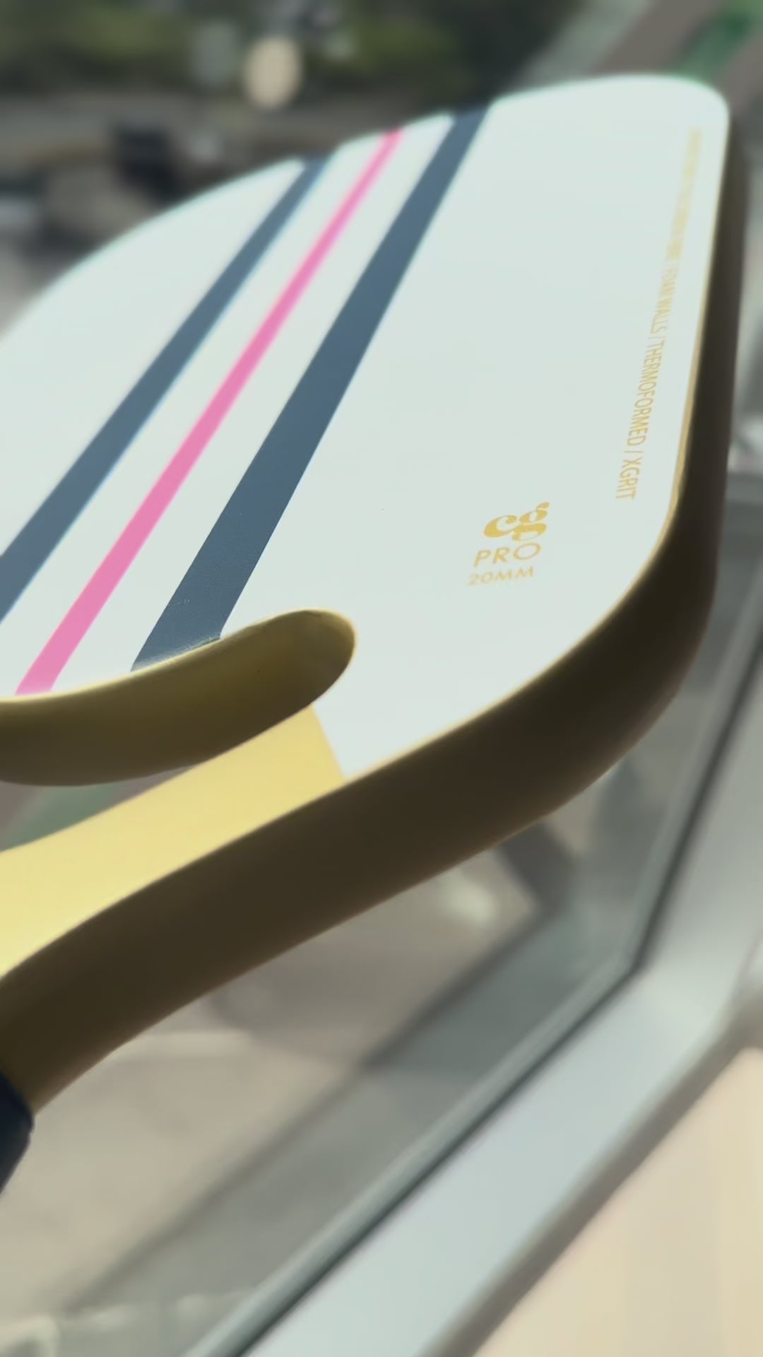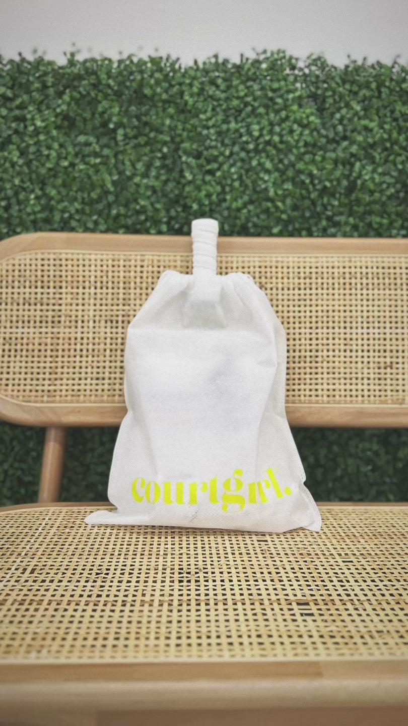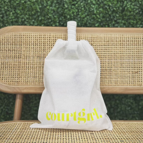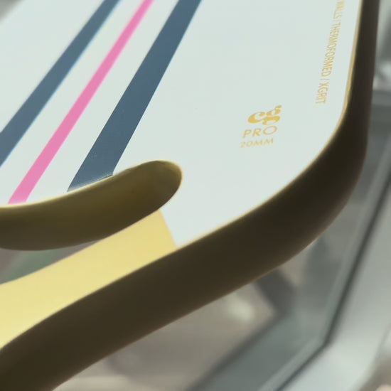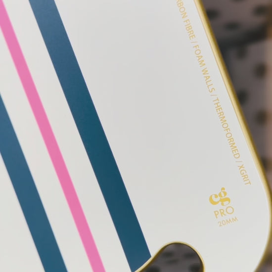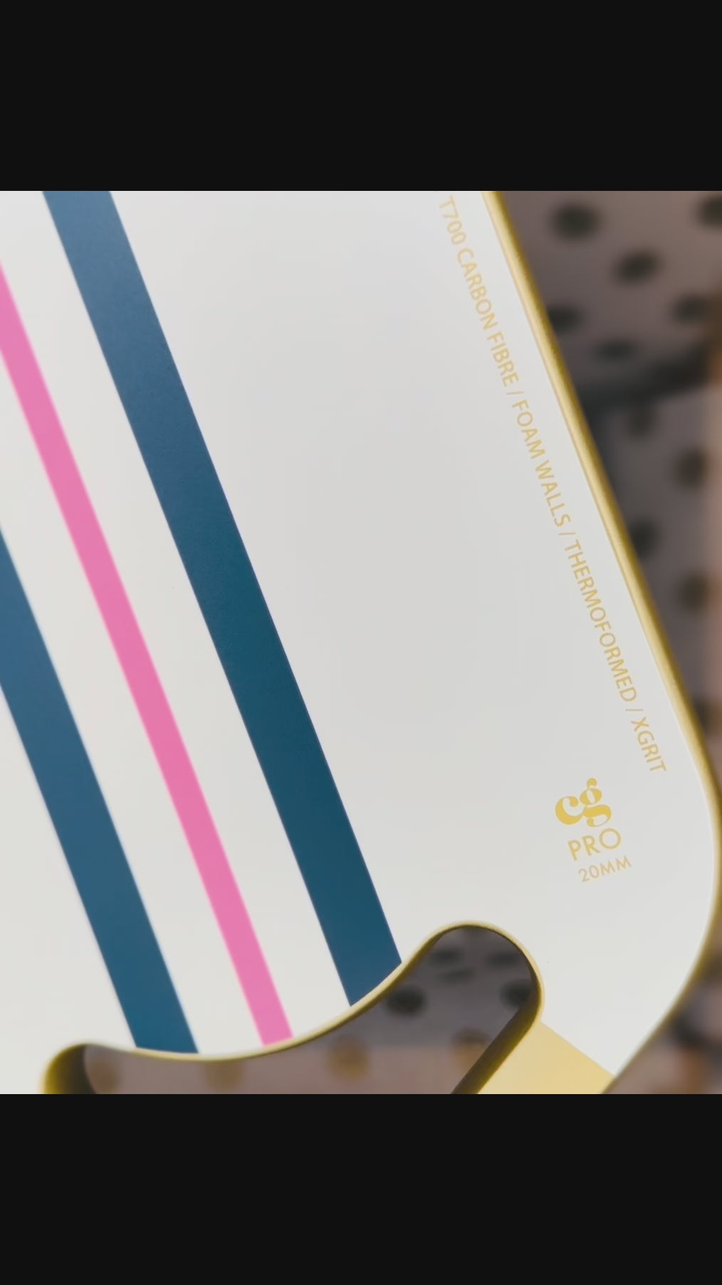 Japanese Toray T700 carbon fibre, thermoformed with foam walls and XGRIT surface for spin and control. A good feel for for the tennis player who also plays pickleball. Extra long face and handle, custom color grip tape. Modern meets retro design with a club aesthetic in your choice of—white paddle with navy/green stripe and metallic silver details or navy/deep pink stripe with metallic gold details. Coordinating colors and pattern in the towel and water bottle pull it all together.