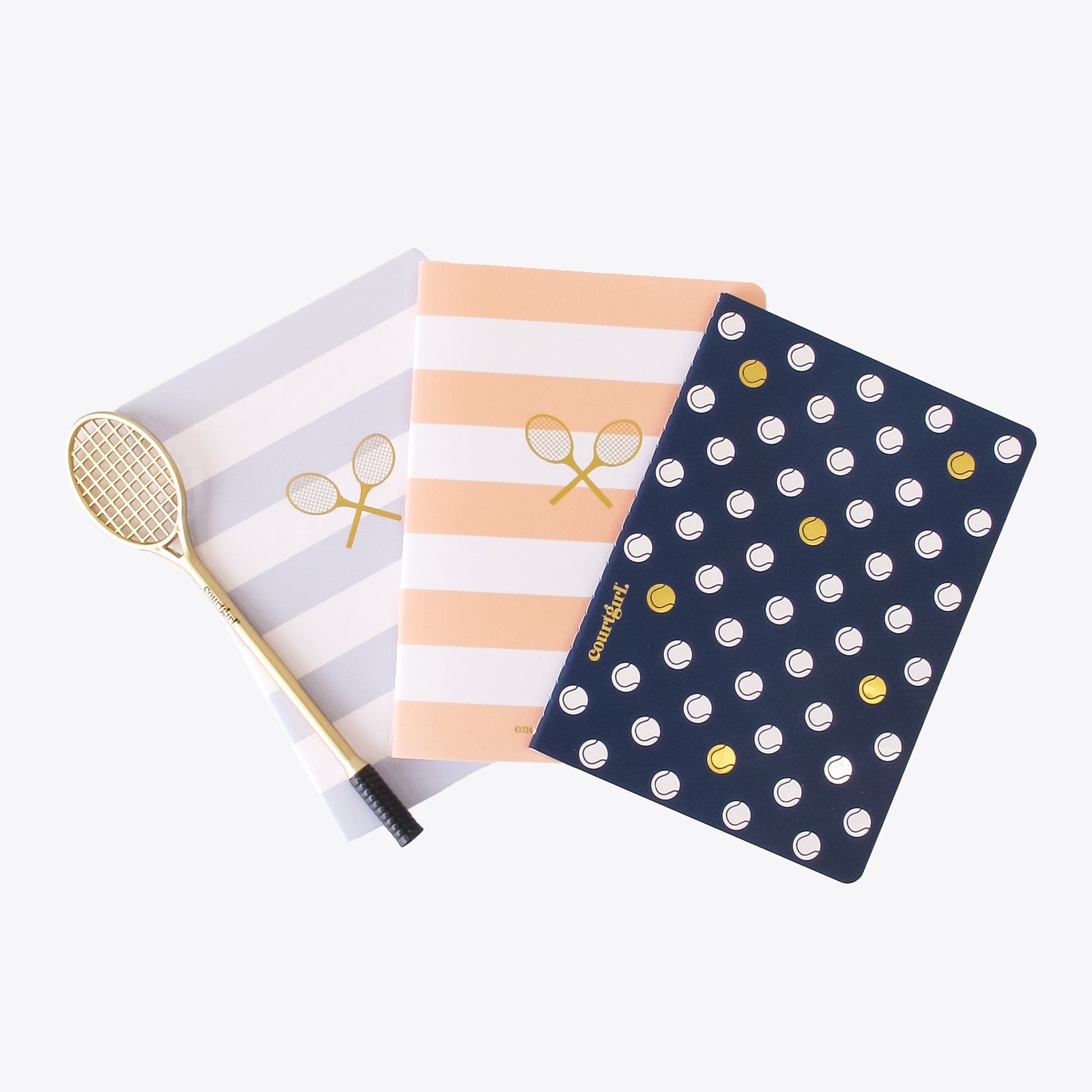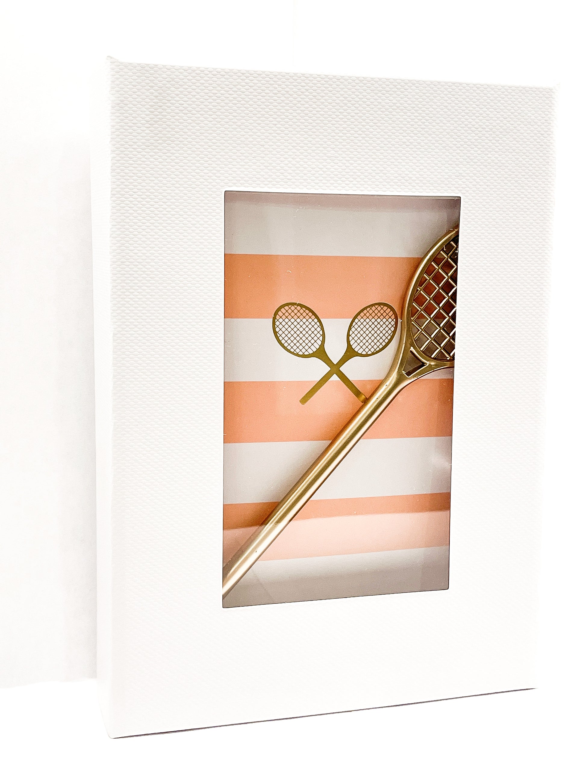 Jot down Coach’s tennis tips, lists, inspiration or anything you may need to remember in this sporty chic journal and tennis racquet pen set. Gold foil details on the covers, dotted pages inside and a pen that makes everyone smile. Ideal gift to delight any tennis lover.