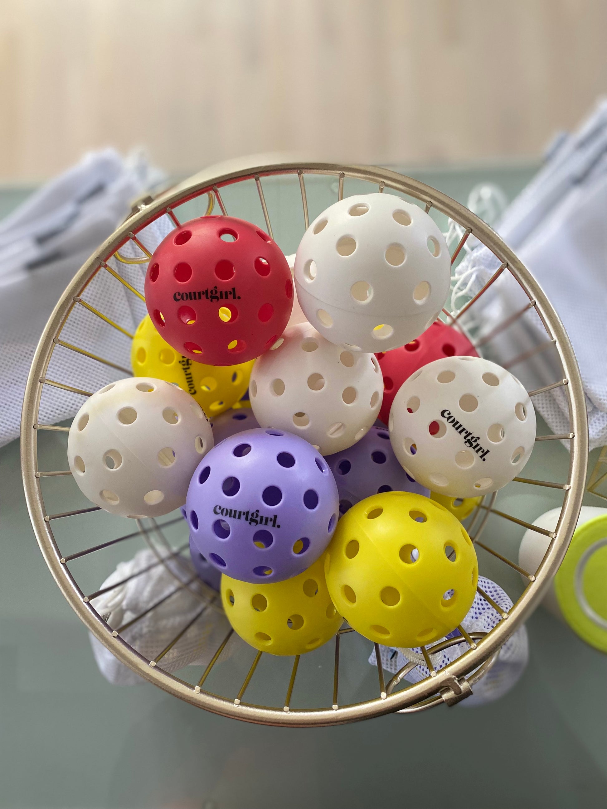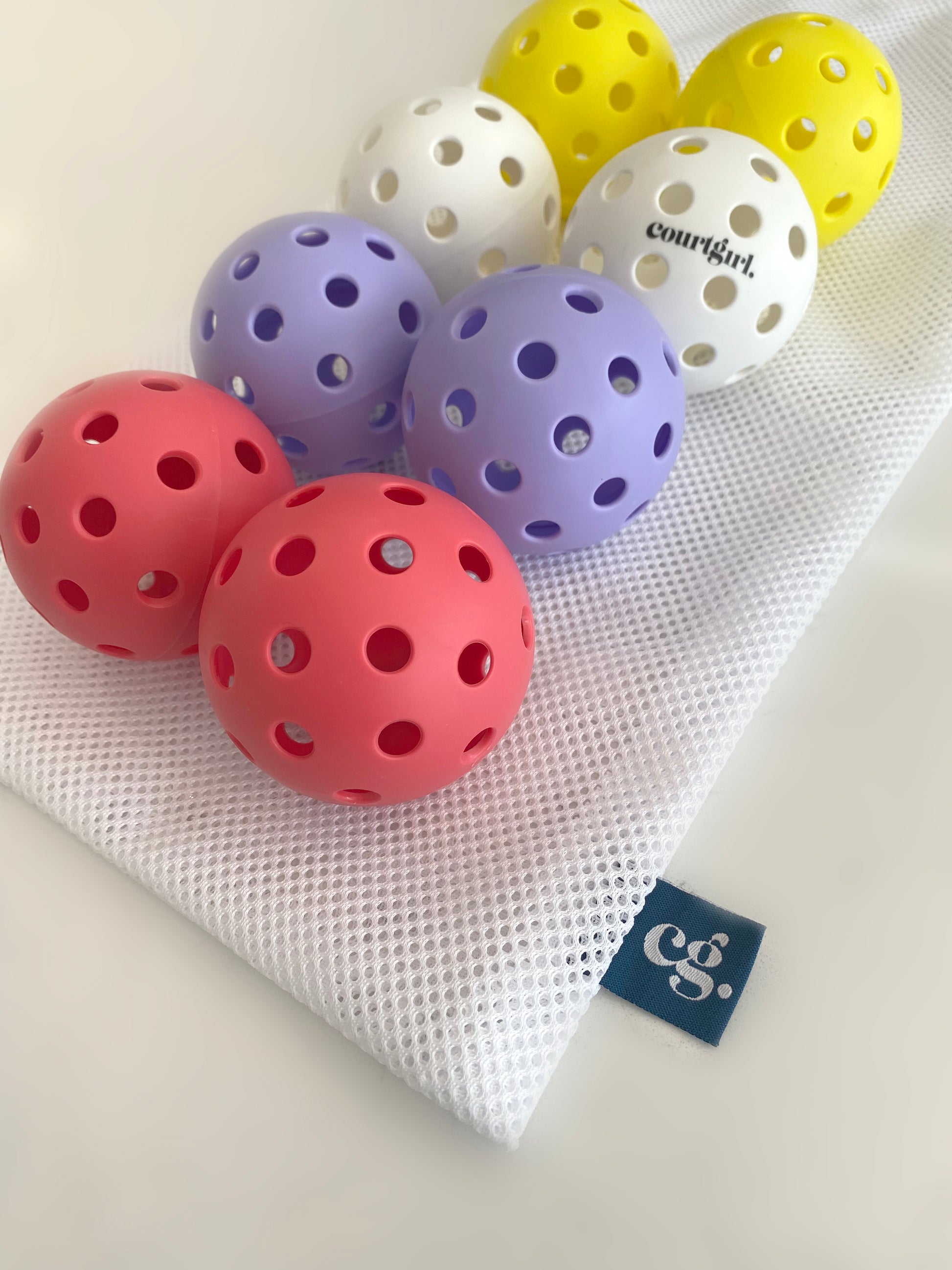 Sweet as candy, these custom color pickle balls designed exclusively for Courtgirl are a thoughtful gift for any pickleball enthusiast. One-of-a-kind set of 8, outdoor pickle balls.