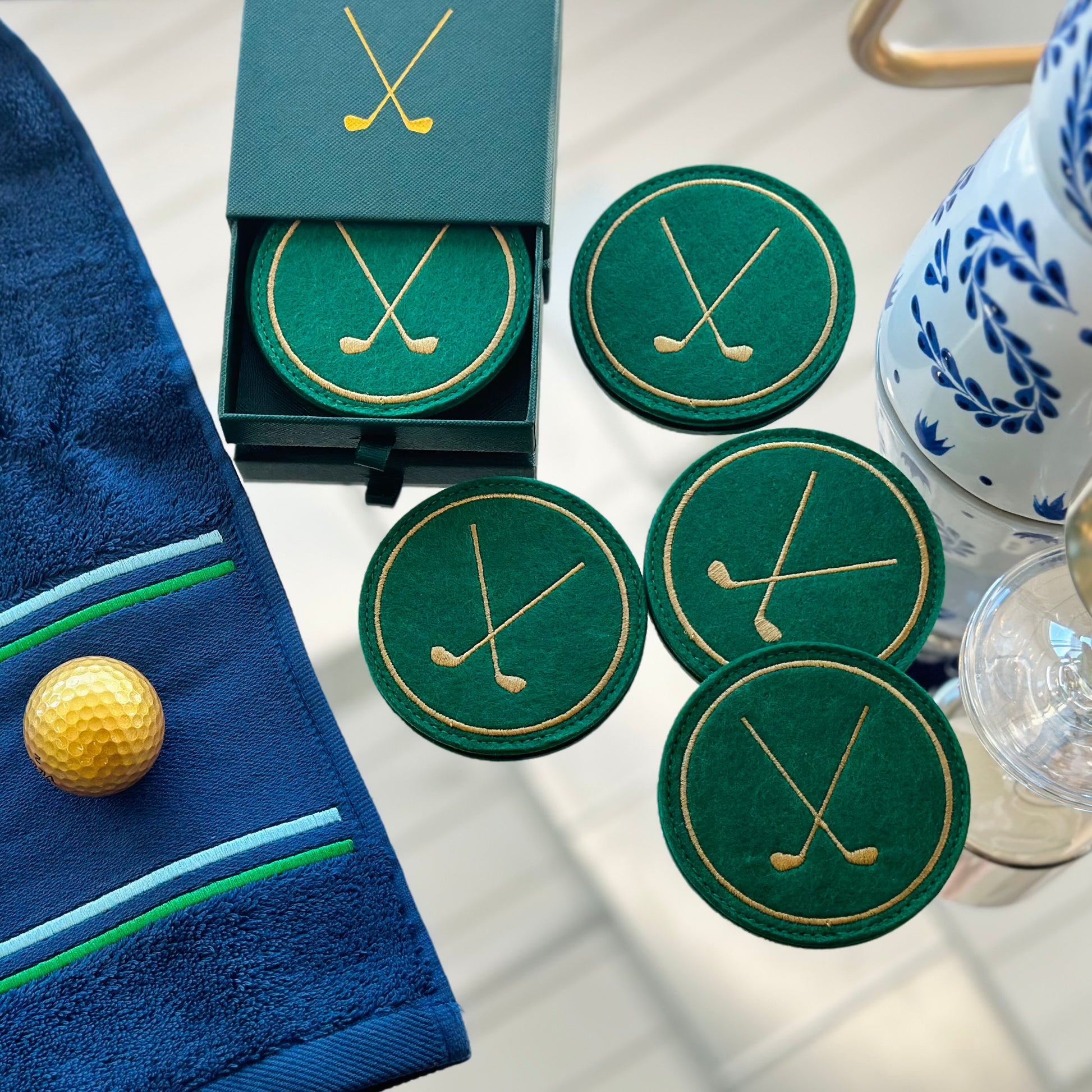 We are in love with these elegant felt coasters. One of a kind design with gold embroidered golf clubs on the front and signature logo on the back. Perfect gift for the golf lover who has it all… Set of 4 in a green linen gold foil gift box. Limited collection…